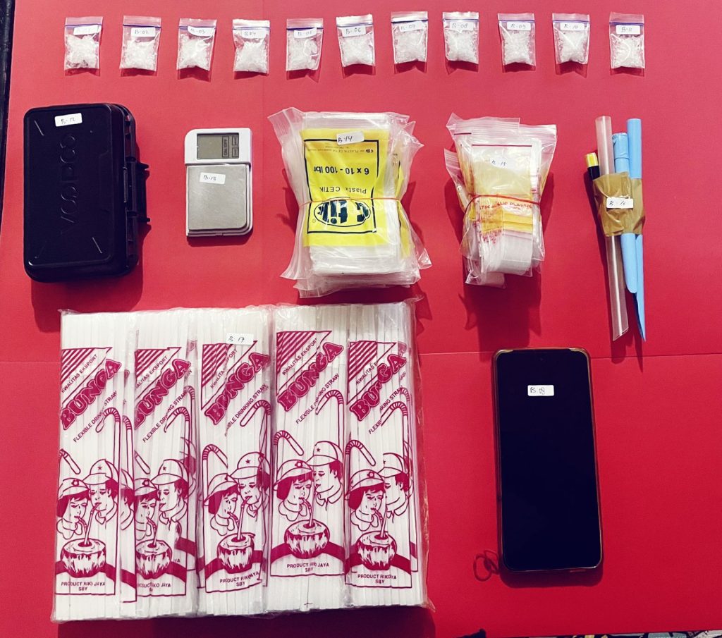Dua terduga pelaku berinisial FR (21) dan FN (22) berhasil diamankan bersama barang bukti berupa 11 paket narkotika jenis sabu seberat bruto 22,54 gram, timbangan digital, plastik klip, pipet, dan satu unit handphone.